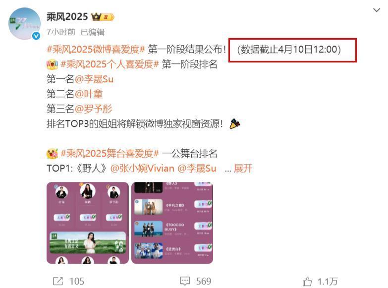 当李晟的热度越来越高,在乘风值榜单中,李晟获得第一名,这个榜单打投结束后,网友们发现,节目组又推出一个榜单,“乘风2025微博喜爱度”榜单,在第一阶段的投票中,李晟依旧获得第一名,紧随其后的是叶童、罗予彤、吴宣仪、祝绪丹等人。